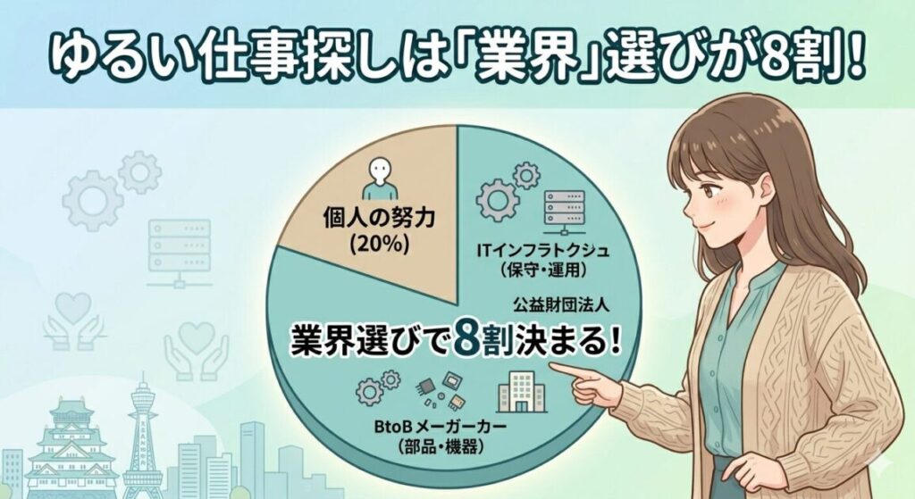 同じ業界でも「職種」を変えるだけでゆるさは大きく変わります。エージェントに相談する際は「業界」だけでなく「この職種は避けたい」もセットで伝えることが重要です。